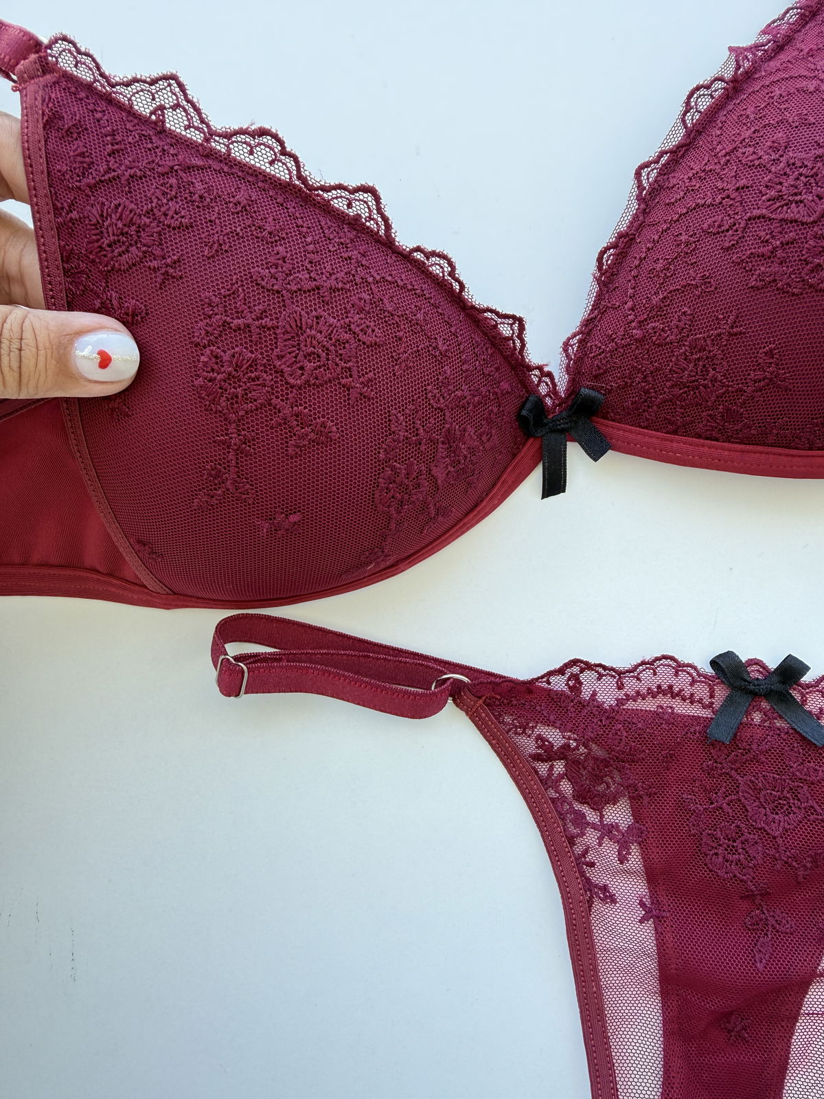 Conjunto de tul bordado triangulito soft sin push up y colaless con reguladores.